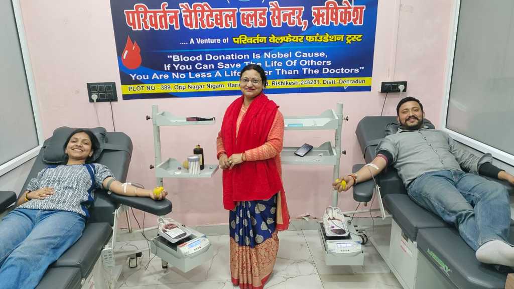 परिवर्तन चेरिटेबल ब्लड सेंटर, ऋषिकेश में शुभम और नेहाल ने मां के 54वें जन्मदिन पर किया रक्तदान