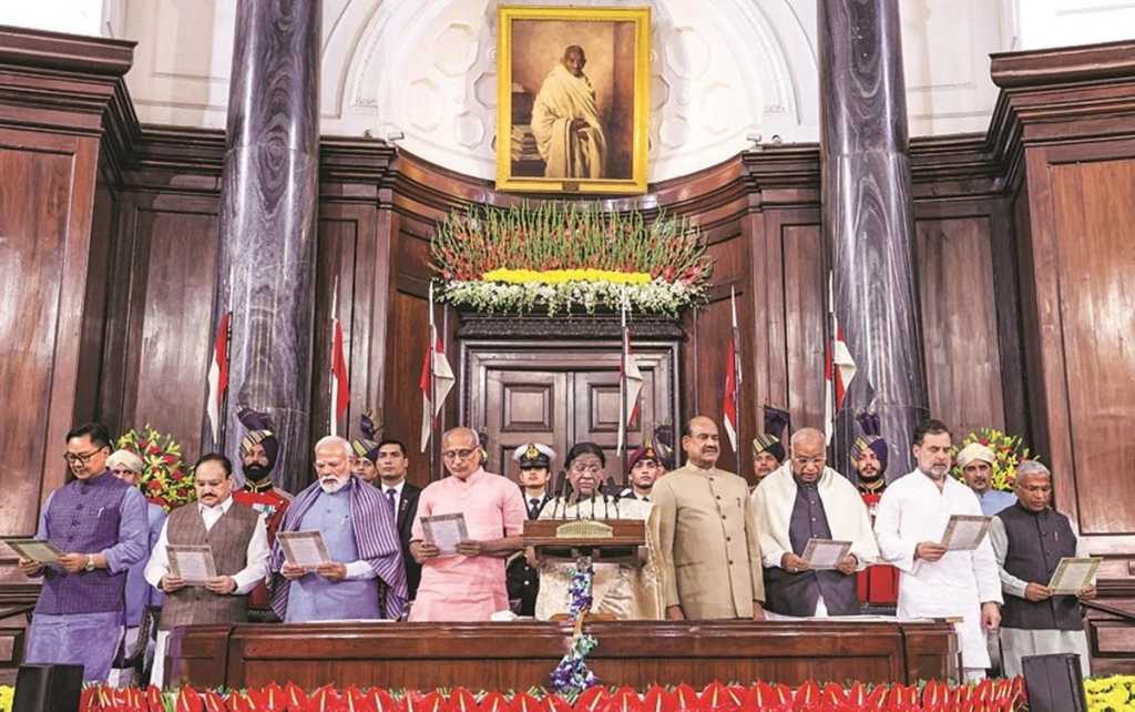 संविधान दिवस के मौके पर संसद के केंद्रीय कक्ष में आयोजित विशेष समारोह में देश के शीर्ष संवैधानिक पदाधिकारी उपस्थित रहे। राष्ट्रपति द्रौपदी मुर्मू, उपराष्ट्रपति सी.पी. राधाकृष्णन, प्रधानमंत्री नरेंद्र मोदी, लोकसभा अध्यक्ष ओम बिरला, केंद्रीय मंत्री किरेन रिजिजू, जेपी नड्डा सहित कई गणमान्य व्यक्तियों ने कार्यक्रम में हिस्सा लिया।